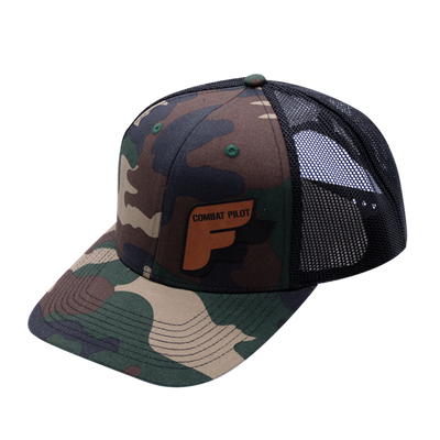 This six panel structured trucker styled hat has a Camo Front and Black Mesh Back featuring a Leatherette FF Combat Pilot Logo.